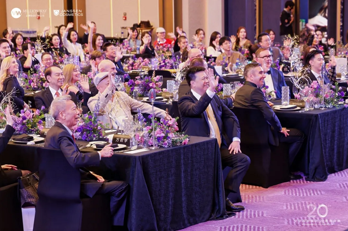 盛典尾声,全体嘉宾集体合影定格高光时刻,香槟祝酒、切蛋糕仪式共同致敬20年荣耀征程。晚宴环节亮点纷呈:“优秀合作伙伴颁奖”为行业伙伴加冕;美高梅行政总厨亲述菜品巧思,米其林级美食与璀璨光景相映成趣;“亮而彩仪器介绍”展现美业科技前沿;康养大师仪器等重磅抽奖活动,以满满诚意回馈伙伴信任,将现场氛围推向顶点。