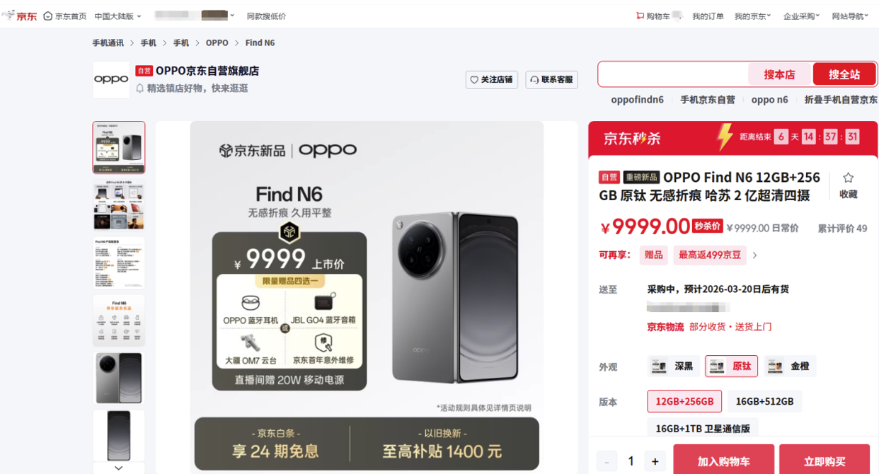 来京东先人一步下单OPPO Find N6 以旧换新至高补贴1400元