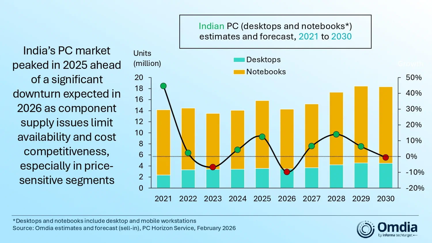 Omdia:印度 2025 年 PC 出货增长 12.5%,但 2026 年预计衰退 9.8%