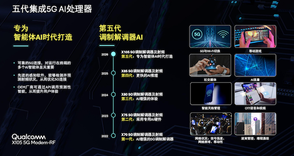 高通X105内置的第五代5G AI处理器,专为智能体AI时代打造,能够利用调制解调器内的智能体AI实现连接能力提升。先进的感知软件,能够检测并预测射频状况,从而优化5G连接。OEM厂商可通过API调用预测性智能,最终提升不同用户场景下的性能,带来卓越的5G-A性能与用户体验。