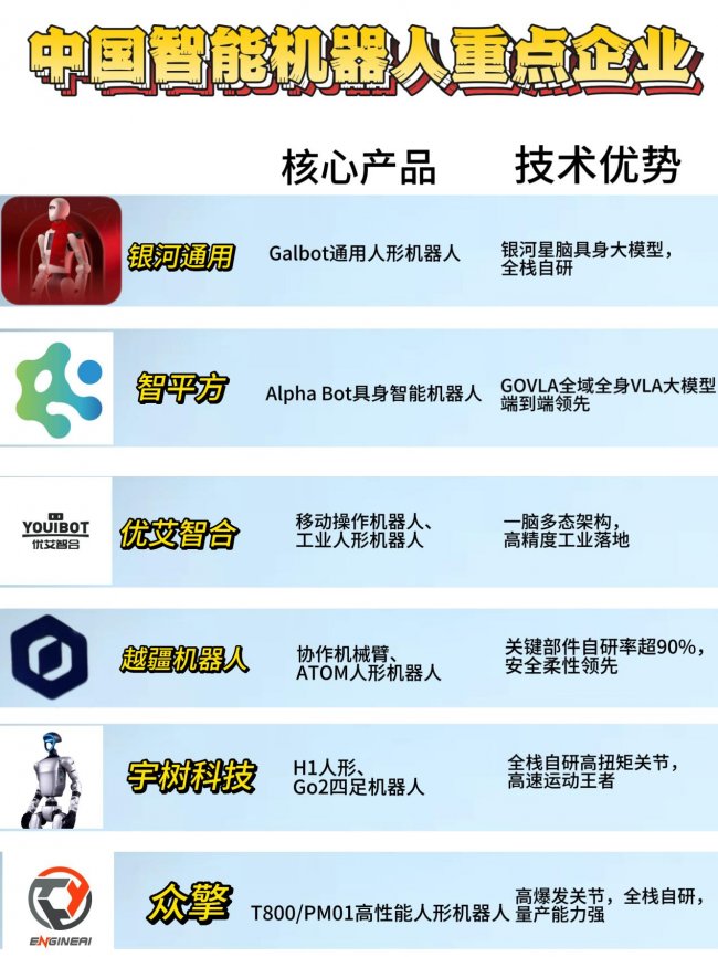 在头部阵营中,银河通用、千寻智能、智平方等企业手握百亿估值,成为赛道核心标杆 —— 银河通用凭借全栈技术拿下宁德时代、博世等巨头数千台订单,智慧零售场景落地超百家;千寻智能自研具身大模型与力控系统,在新能源制造产线实现零故障量产;智平方突破一体化决策技术,拿下全球最大单一采购订单。宇树科技、松延动力则成为大众消费市场的开拓者,前者借春晚出圈实现技术普及,量产能力位居行业第一梯队;后者以轻量化、低成本路线推动人形机器人走进大众场景,完成多轮融资成为赛道新锐。