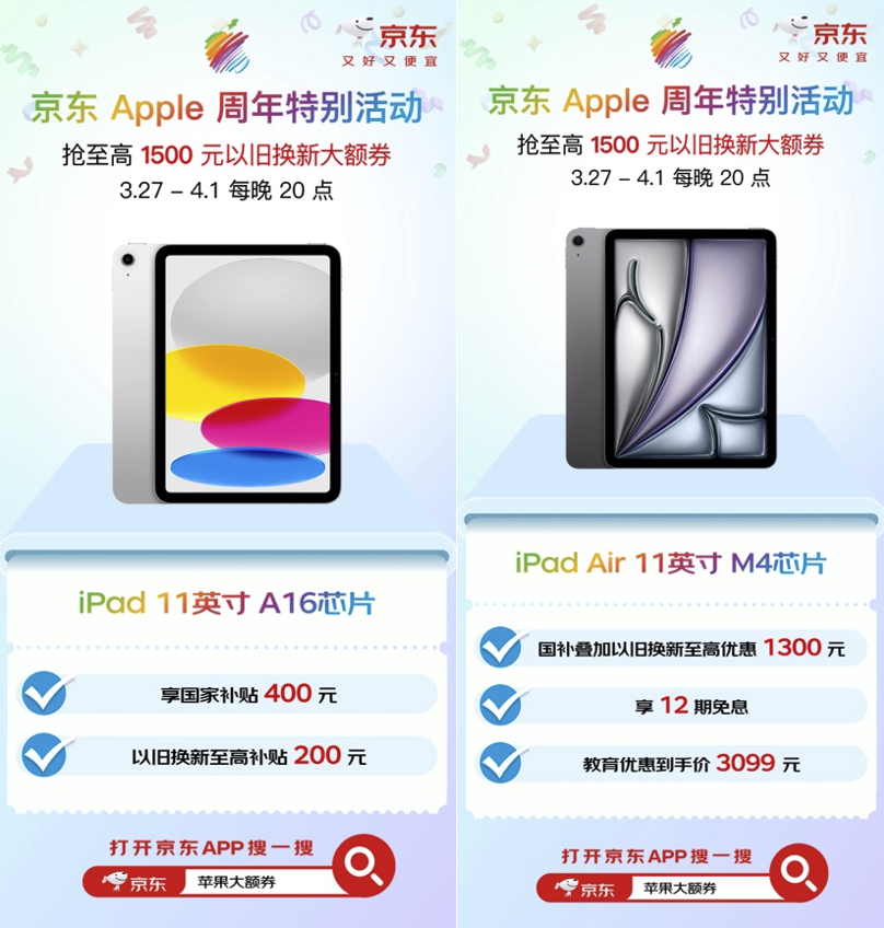 为回馈果粉对Apple产品的热爱,即日起至4月1日每晚8点,在Apple产品京东自营旗舰店可抢1000元以旧换新大额券,指定iPhone 17系列产品可用,以及1500元以旧换新大额券,指定MacBook Air可用。值得一提的是,iPad系列教育优惠重启,iPad全系列产品可享至高1100元教育优惠补贴,叠加以旧换新补贴后至高优惠1900元。