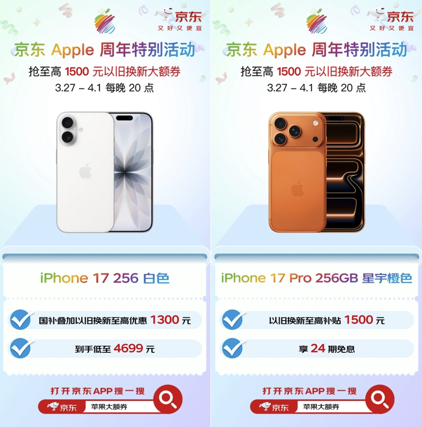 Apple 50周年京东特别活动上线 购iPhone 17 Pro系列以旧换新至高补1500元