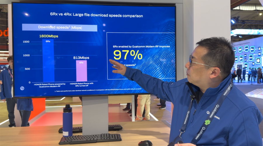 高通展台的演示专门挑选了几个日常生活中常见的信号不佳环境进行对比测试。相比传统4Rx,开启6Rx功能的同款机型,在封闭会议室场景下的文件下载测试中速率提升达97%;在走廊信号死角场景下总计180秒的测试时长中,观看直播时的卡顿时长减少60%,卡顿率减少34.39%。