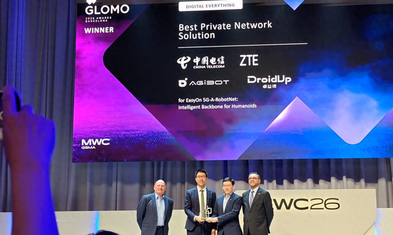 2026年世界移动通信大会(MWC26)期间,备受瞩目的GSMA全球移动大奖(GLOMO Awards)正式揭晓。中国电信上海公司(以下简称“上海电信”)携手中兴通讯、智元机器人、卓益得机器人,凭借创新方案“EasyOn 5G-A RobotNet”,一举摘得“最佳专网解决方案奖”(Best Private Network Solution)。这一殊荣不仅有力印证了中国电信在5G-A与具身智能融合领域的创新实力,也充分体现了上海电信聚合产业生态、推动AI+战略落地取得的实质性成果。