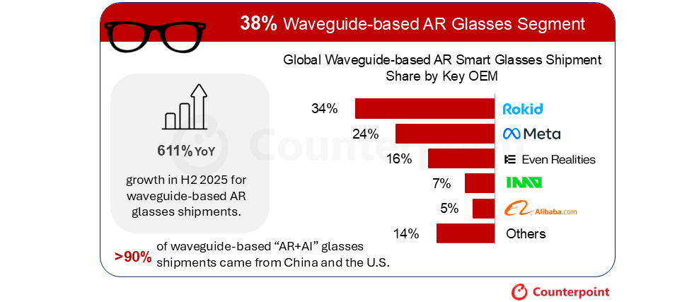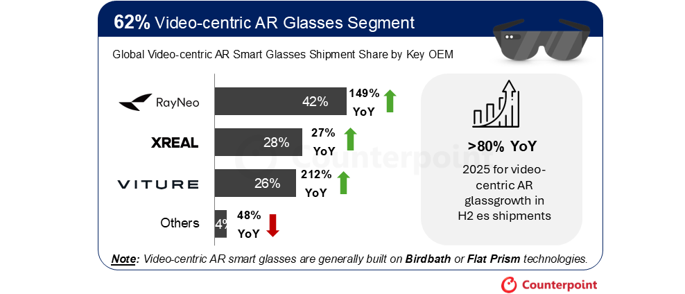 CounterPoint 报告 2025 下半年全球 AR 眼镜出货量增 148%:视频型雷鸟占 42%、波导型乐奇 34% 领跑