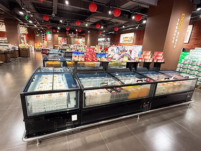 中山喆子超市定位中高档精品生活超市,原有冷冻岛柜存在三大核心问题:一是空间与品类矛盾突出,固定布局导致冻品混放,SKU仅120个左右,无法满足中高端客群“一站式购齐”需求;二是运营成本高企,每日手动除霜耗时1.5小时,冻品损耗率高达8%,补货频次达每日4-5次,人力与损耗成本持续攀升;三是展示形象与定位脱节,普通冷柜玻璃起雾、灯光昏暗,高端冻品无法凸显品质感,冻品区坪效仅为门店平均水平的60%。