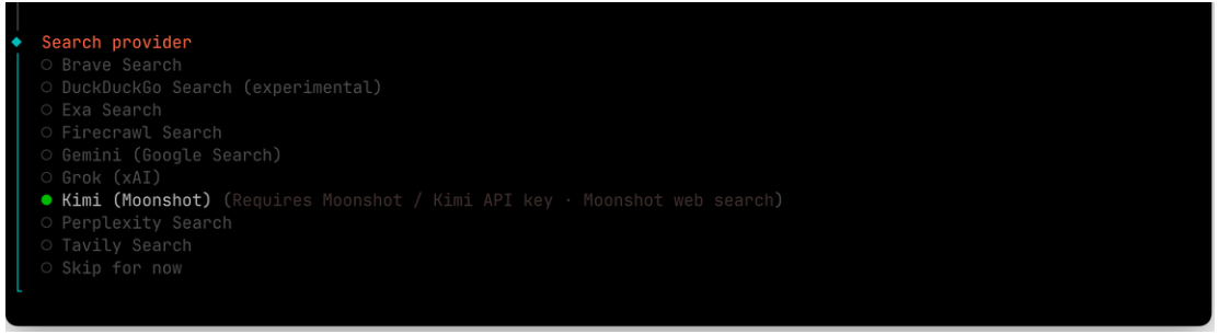 选择 Model,这里我们按需选择 OpenClaw 创始人推荐的 Moonshot AI(Kimi K2.5)/ Open AI/ Anthropic 作为基础模型。(本次选择的是 Kimi K2.5 进行演示)