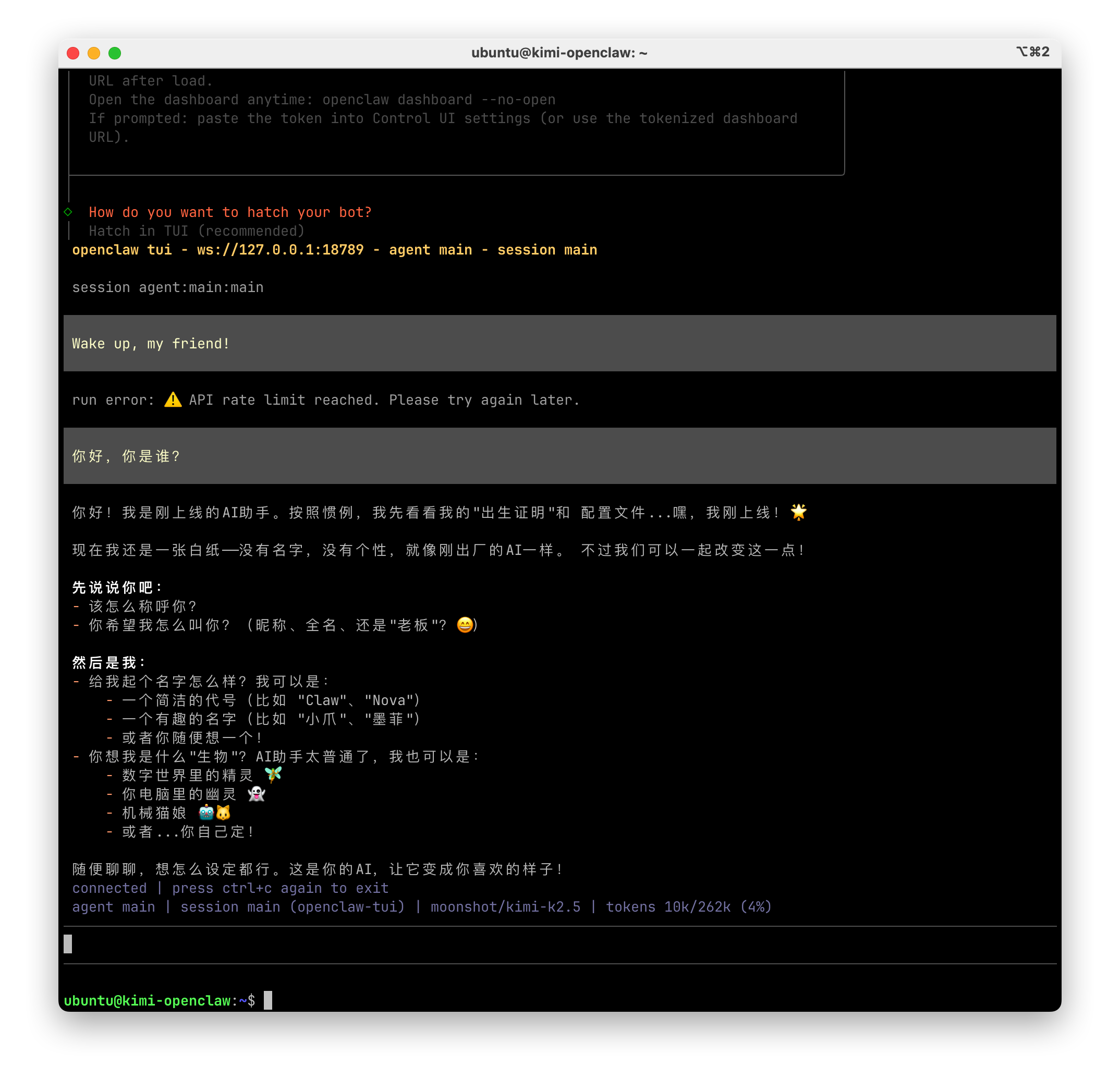 将复制的 API Key 贴入终端并敲击回车,然后选择 Moonshot/Kimi-K2.5 模型并敲击回车确认。