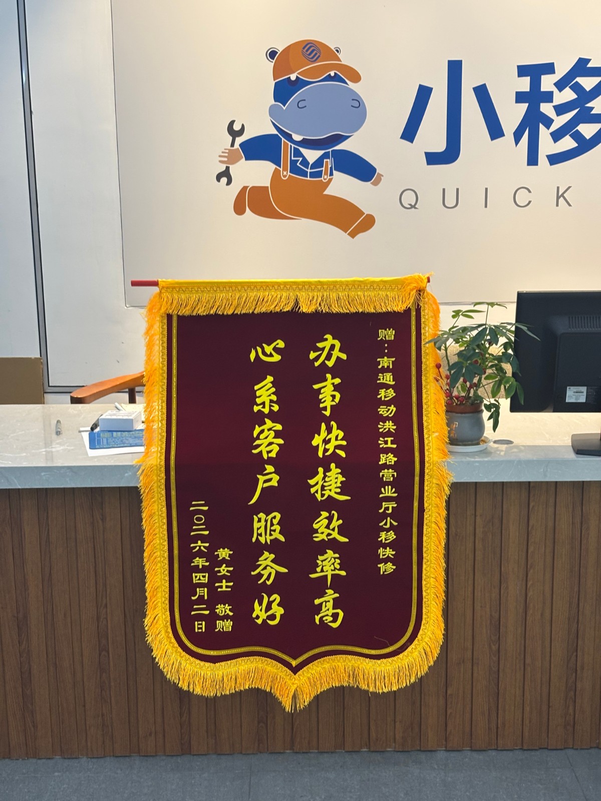 为表感谢,黄女士特意定制锦旗送至服务厅,高度赞扬南通移动小移快修高效贴心、有温度有担当的服务,称赞南通移动工作人员真正做到急用户之所急、解用户之所难,以专业能力与暖心服务守护了群众的切身利益。