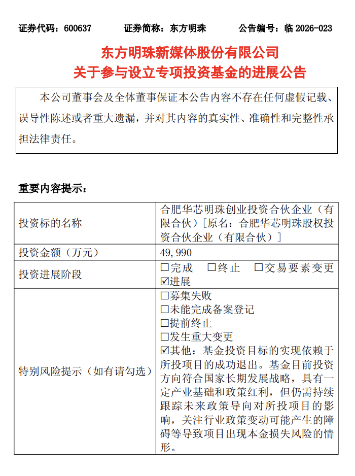 今日,东方明珠发布公告,披露其参与设立的专项投资基金——合肥华芯明珠创业投资合伙企业(有限合伙)(原名:合肥华芯明珠股权投资合伙企业)的最新进展。