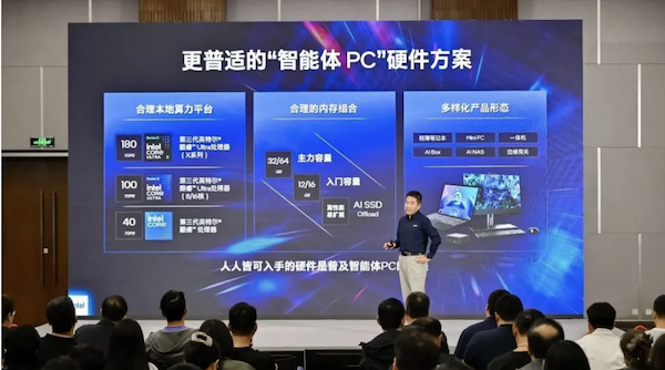 凭借酷睿Ultra和酷睿处理器的强大本地算力,单台智能体PC就能以混合AI部署方式运行OpenClaw等智能体,其产品形态覆盖从轻薄本、Mini PC、一体机到AI Box、AI NAS、边缘网关等全场景,为不同需求的用户提供清晰的能力定位。
