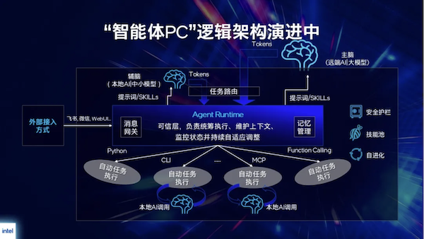 智能体PC是为高效运行智能体而打造的AI PC。它以强大的本地智能体为核心,不仅能自主完成复杂任务的闭环处理,更具备记忆、自主学习及迭代进化的能力。它采用的“本地辅脑+云端主脑”混合架构,能够高效分配任务,从而实现了性能、隐私保护、成本与响应速度的绝佳平衡。其中,“辅脑”能力由PC端的本地AI和中小模型构成,“主脑”则协作远端AI和大模型。