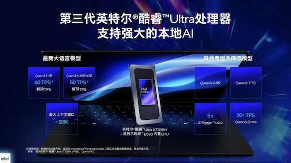 ●旗舰配置:搭载第三代酷睿Ultra X系列处理器并配备32GB以上内存,能够流畅运行Qwen3.5/3.6(35B)、Gemma4(26B)等大型语言模型及Qwen3-VL、MiniCPM-O-4.5等复杂多模态模型,并同时支持主流与入门级模型和应用。