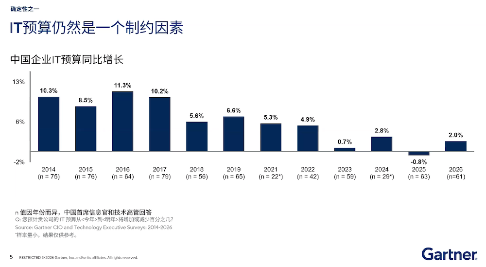 飞象原创(魏德龄/文)“砍预算了。”这可能是近年来,经常听到的一话。Gartner的数据也印证了这点,自2014年开始,中国企业的IT预算占比基本维持在10%左右,但在2018年开始逐步下跌,2025年甚至达到最低点-0.8%,今年来到2%。