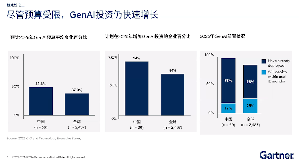与IT预算缩减相对应的正是生成式AI投资预算的增加,在中国预计今年GenAI的预算会增加48.8%,高于全球的37.9%。据陈勇介绍,在Gartner的调研中,有94%的企业说:“我会在这方面增加投入”,全球是84%。在2026年已经部署GenAI的已经有78%,而全球平均只有58%。