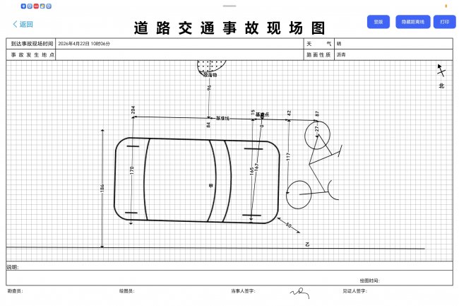 固定现场后,结合智能绘图平板,可以实现现场智能快速处理和智能出图。系统可自动识别并分类关键证据,如车轮、路面痕迹、散落物等,匹配国标图符;借助AI和简单拖拽完成制图,即刻生成现场图和实景记录图。