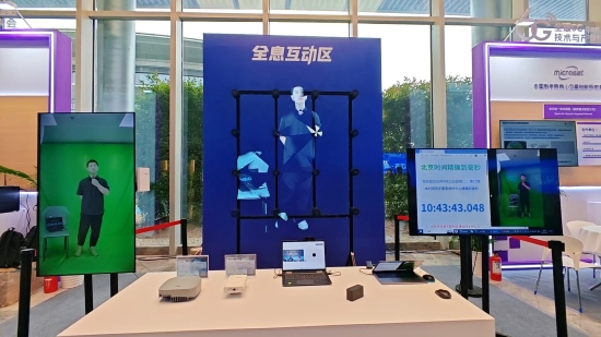 全息互动展台前同样聚集了不少观众,身在北京的工作人员赵愈祝被实时全息投影在背景板上,身形清晰、动作流畅,无丝毫卡顿,而一旁电脑显示屏上的直播画面则明显滞后。“传统互联网直播时延约4秒,我们通过6G专网与3D全息投影技术,将其实时投射至南京主会场,时延仅0.3秒。”展台负责人介绍。