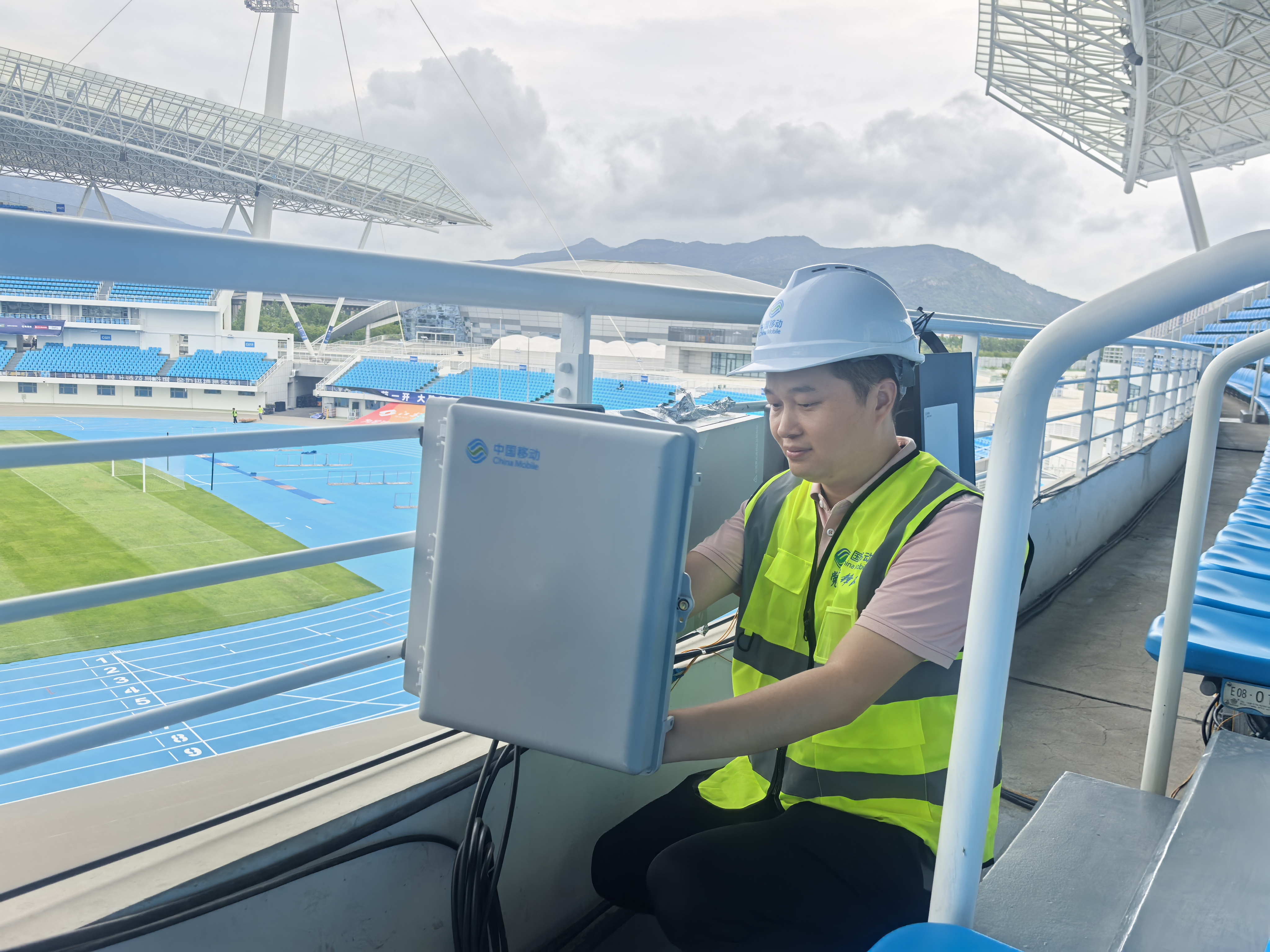 (移动工程项目经理在场馆内检查、验收5G网络设备施工质量)