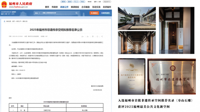 石卿艺术馆的传承与运营成果,也得到了官方部门的高度认可,收获了多项重磅荣誉,成为官方认可的非遗传承标杆与公共文化典范。其成功入选福州市首批非遗传承空间推荐名录(寿山石雕),是官方对其非遗传承工作的充分肯定;获评2025福州最美公共文化新空间,彰显了其在公共文化服务领域的突出贡献,成为福州展示寿山石雕非遗文化的重要窗口。