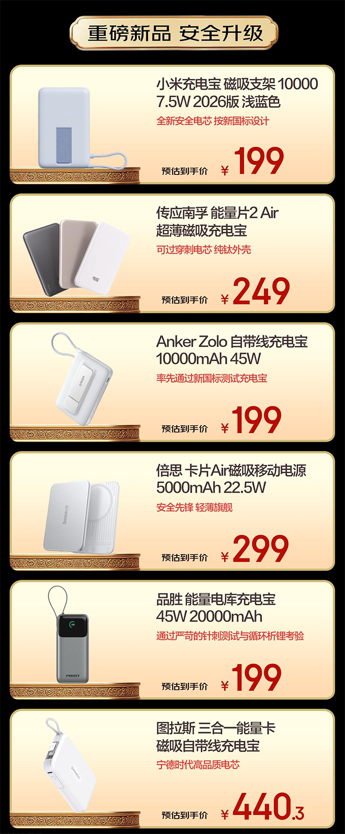 目前,联盟成员已推出多款按照新国标生产的充电宝产品,覆盖不同容量、功能与价格区间,充分满足消费者的多样化需求。其中,小米10000mAh磁吸支架充电宝,安全电芯全面升级,京东预估到手价199元;传应南孚能量片2 Air超薄磁吸充电宝,可过穿刺电芯,京东预估到手价249元;Anker Zolo 10000mAh自带线充电宝,率先通过新国标测试,京东预估到手价199元;倍思卡片Air磁吸充电宝,轻薄又安全,5000mAh版京东预估到手价299元;品胜20000mAh充电宝,通过严格的针刺测试和循环析锂考验,京东预估到手价199元;图拉斯三合一能量卡充电宝,采用ATL苹果手机使用的同款电芯,京东预估到手价440.3元。