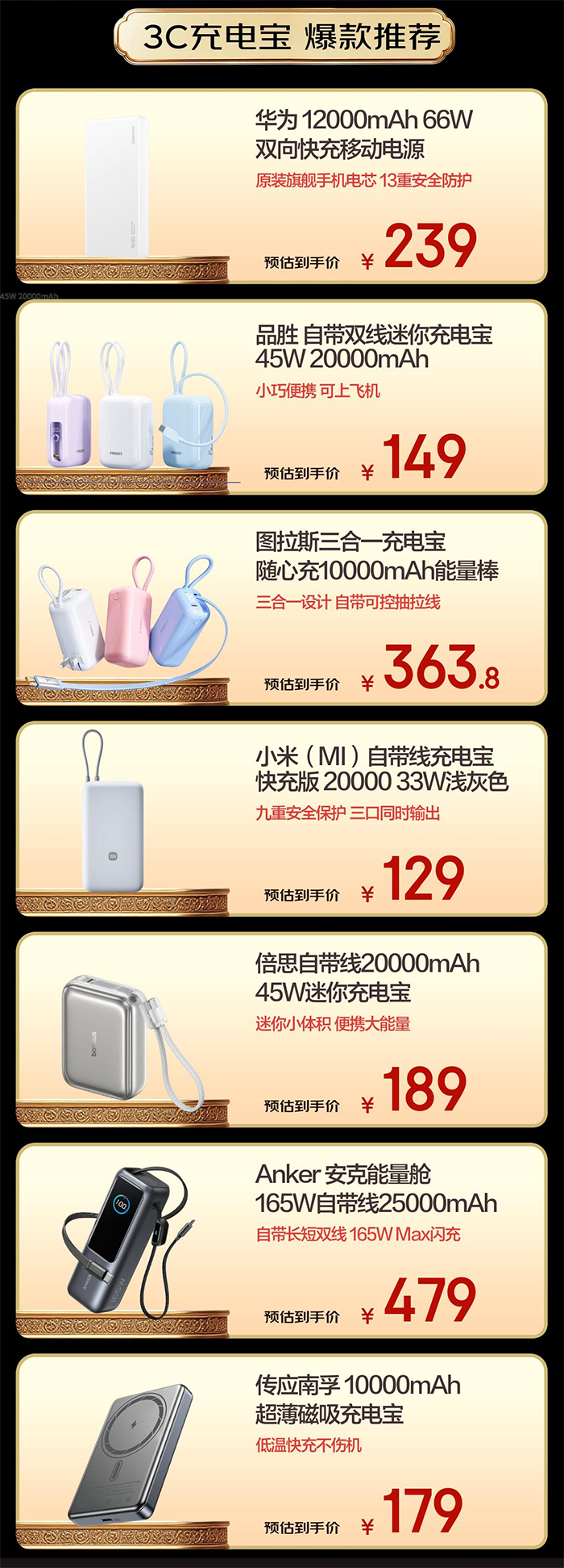 除了按照新国标生产的新品外,还有超多通过3C认证的品质爆款充电宝值得购买。其中,华为12000mAh双向快充移动电源,支持66W快充,采用ATL苹果手机使用的同款电芯,安全更有保障,京东预估到手价239元;品胜20000mAh充电宝,自带双线和三屏智能数显,京东预估到手价149元;图拉斯三合一充电宝,10000mAh大电池,还自带可控抽拉线,京东预估到手价363.8元;小米自带线充电宝,具备九重安全保护、支持三口同时输出,还搭载20000mAh大电池,京东预估到手价129元;倍思自带线迷你充电宝,虽然是迷你的小体积,但拥有20000mAh大电池,京东预估到手价189元;Anker能量舱,25000mAh大电池、支持165W快充,还自带充电线,京东预估到手价479元;传应南孚超薄磁吸充电宝,10000mAh大电池,低温快充不伤机,京东预估到手价179元。