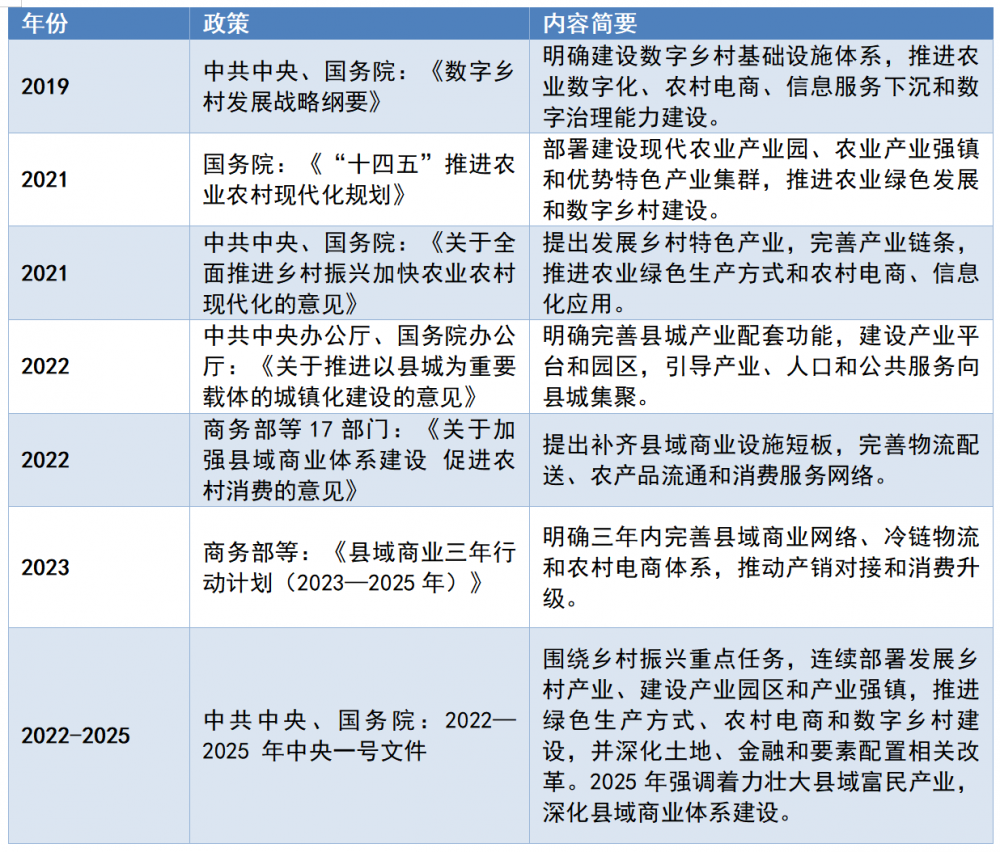 近年来,国家和地方政府持续加大对县域经济发展的政策支持力度(如表1)。这些政策既涵盖乡村振兴、数字乡村建设、县域商业体系建设,也涉及中小企业数字化赋能、工业互联网推广和以县城为载体的新型城镇化建设,政策方向指向明确:稳住县域产业基本盘、做好基础设施补短板、推动传统产业数字化升级、增强县域的产业承载能力、推动产业特色化、集群化发展等。这些政策并非简单的“扶持性投入”,而是在系统性降低县域企业数字化门槛,比如基础网络与算力能力正加速下沉,产业园区、产业集群和特色产业带成为建设重点,数据、平台和应用开始成为政策鼓励方向等。