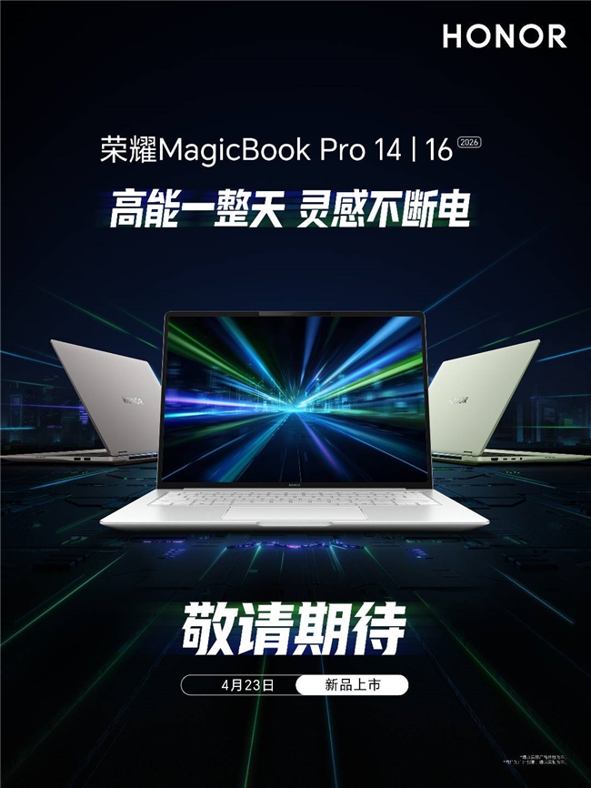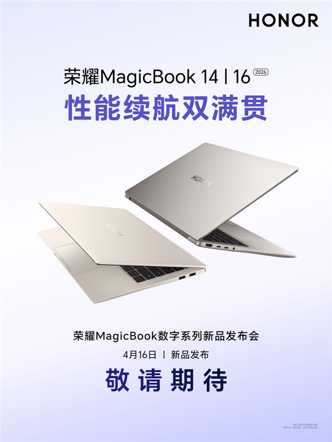 2026荣耀PC家族大爆发!4月7日,荣耀MagicBook系列轻薄本正式官宣新品发布会档期。其中,荣耀MagicBook 14/16 2026定于4月16日发布,荣耀MagicBook Pro 14/16 2026与荣耀WIN游戏本一同定于4月23日发布。此次数字全系新品采用第三代英特尔酷睿处理器,在HONOR Turbo X加持下,将带来续航、性能、屏幕、AI的全新体验,助力大学生用户大学四年一本通关。