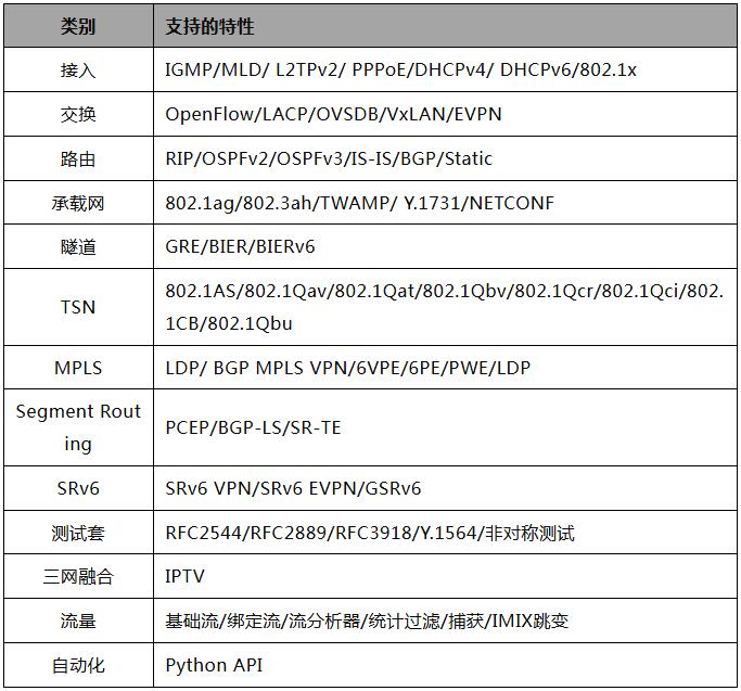 ● 全面的 L2-3 协议支持,包括接入协议、路由交换协议、承载网协议、隧道协议、TSN等功能,具体支持的功能特性如下:
