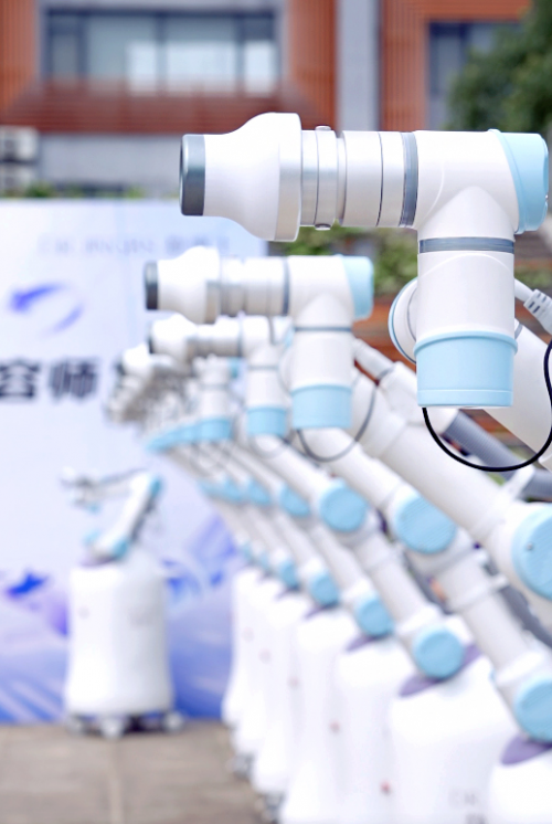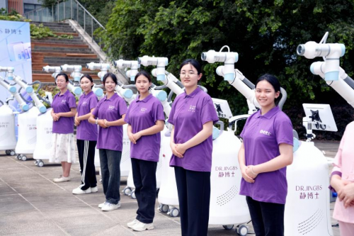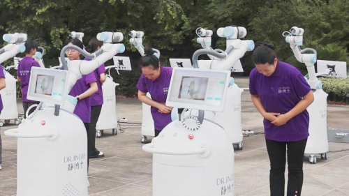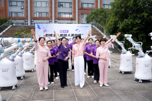 在静博士“AI服务机器人”入职仪式上,一排整齐划一的机器人与新美容师们并肩站立,共同向公司的资深老手艺人行鞠躬礼,老手工艺人也为“智能机器人”带上专属于它的工牌,象征着对传统的尊重和未来的展望!