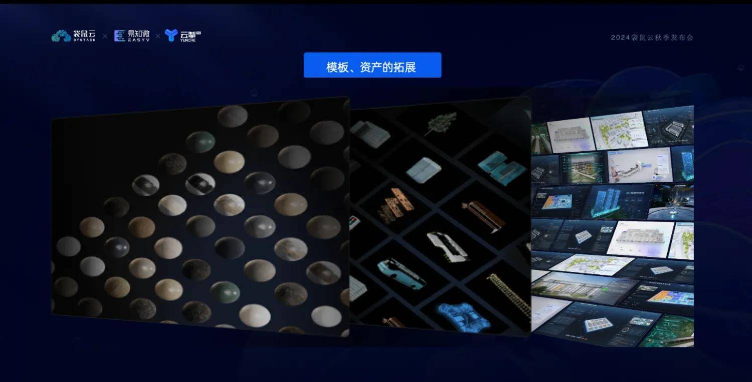 模板、资产的拓展:EasyTwin也在持续不断的沉淀补充资产库,力求借助模板和资产可以实现场景效果开箱即用,例如:行业模板、效果示例、特效材质、贴图和一些装饰模型等。