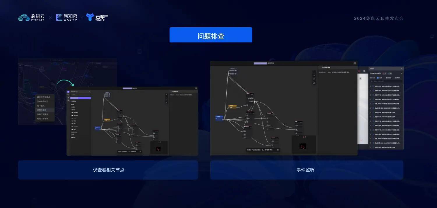 问题排查:比如仅选中节点后查看与之相关的节点、事件的监听、打印节点输入输出的数据等。