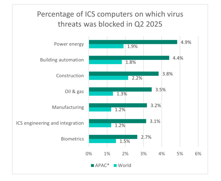 2025年第二季度,受病毒威胁影响最大的亚太地区行业包括电力能源、建筑自动化、石油与天然气、制造业以及工业控制系统(ICS)工程与集成。