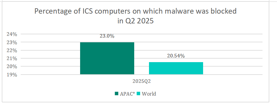 就拦截到恶意对象的ICS计算机总体百分比而言,2025年第二季度,亚太地区达到23%,比全球平均水平20.54%高出近3%。