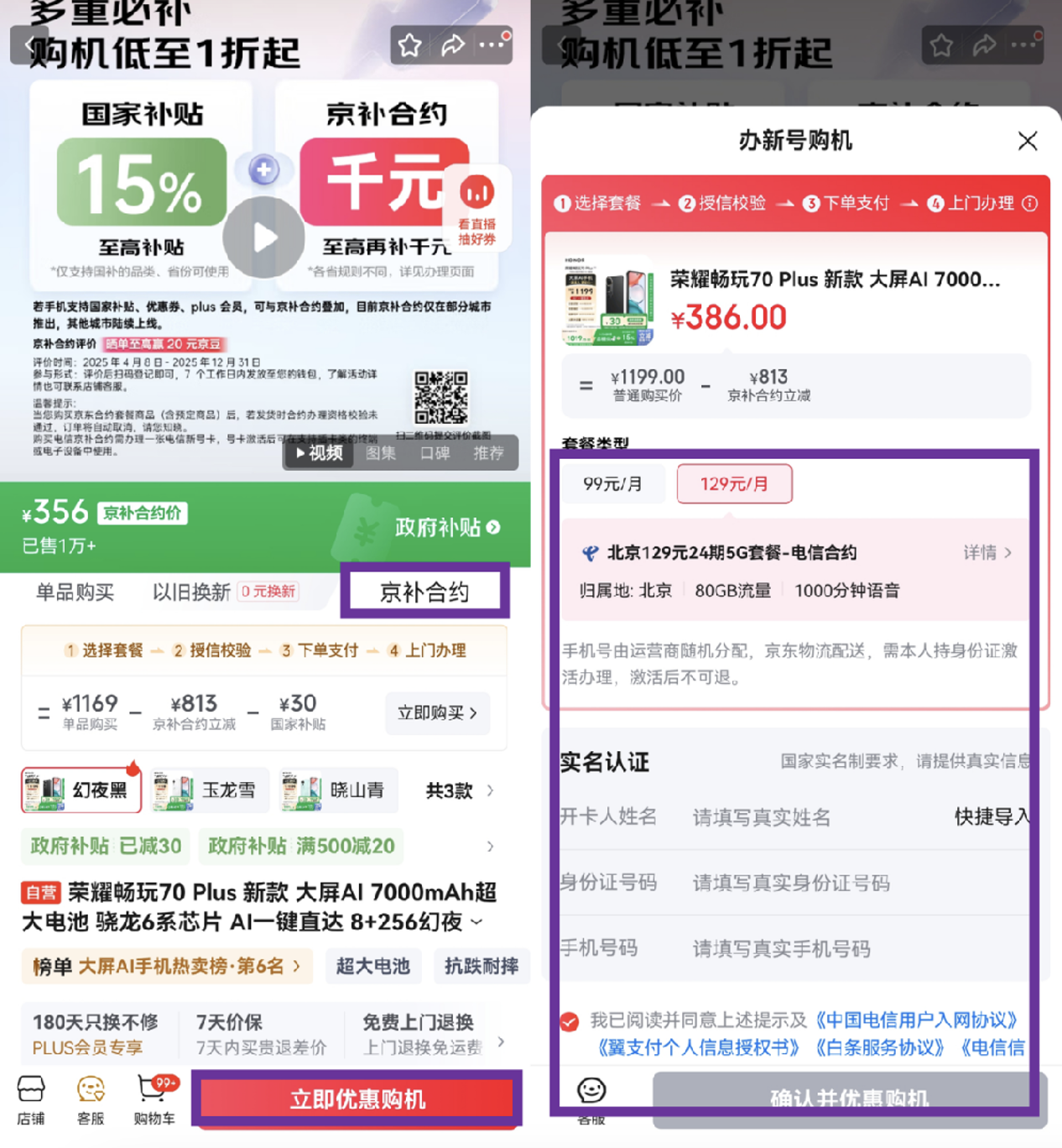 此外,在京东购买京东大屏AI手机荣耀畅玩70 Plus还可以通过“京补合约”下单,享受专属低价福利。以北京为例,当地消费者选择北京129元24期5G电信套餐,享京补合约立减813元,荣耀畅玩70 Plus原价1199元,到手价386元。数据显示,通过“京补合约”下单的销量占比超20%。感兴趣的消费者可以在京东APP首页搜索“荣耀畅玩70 Plus”,选择荣耀京东自营旗舰店的商品,点击“京补合约”,然后点击立即优惠购机,选择补贴套餐后按要求填写信息并下单。京东快递小哥将上门协助消费者完成信息核验和套餐激活等流程,一站式搞定3C数码产品、新号卡、新套餐,足不出户就能省钱购机。
