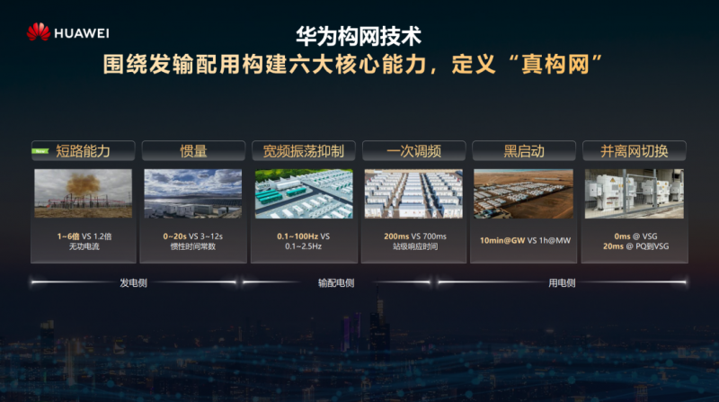 在国家双碳目标的指引下,近年来新能源产业快速发展。随着新能源渗透率的持续提升,电力系统“双高”(高比例新能源、高比例电力电子设备)特征明显,对电力系统的安全、稳定运行提出了新的挑战。构网技术是解决电网稳定和平衡的关键技术,将支撑新型电力系统安全、稳定运行。蔡凌宇表示,华为构网技术围绕“发输配用”全场景构建六大核心能力,定义“真构网”。通过基础元器件、功率模组、构网算法的突破,系统架构设计的创新,实现了系统过载能力、惯量响应时间、宽频振荡抑制范围、一次调频响应时间、黑启动速度与能力、并离网切换等功能的跨越式提升。经实践检验,大幅提升了新能源的并网消纳水平和新型电力系统的稳定性。