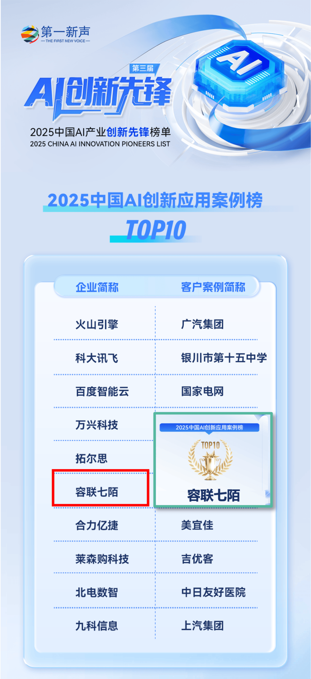 近日,智能客服领域捷报频传。容联七陌凭借其在人工智能技术研发与场景化落地方面的卓越表现,接连入选至顶网发布的 「2025全球人工智能全景图谱」 与第一新声发起的 「2025中国AI创新应用案例榜」。