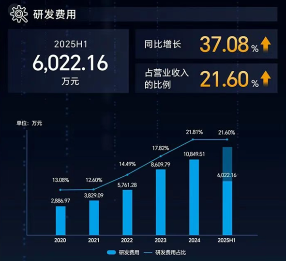 从研发投入的绝对金额来看,2025年上半年,公司研发费用投入高达6022.16万元,同比增长37.08%,这一增速明显高于营收增速,显示出公司对技术创新的高度重视。