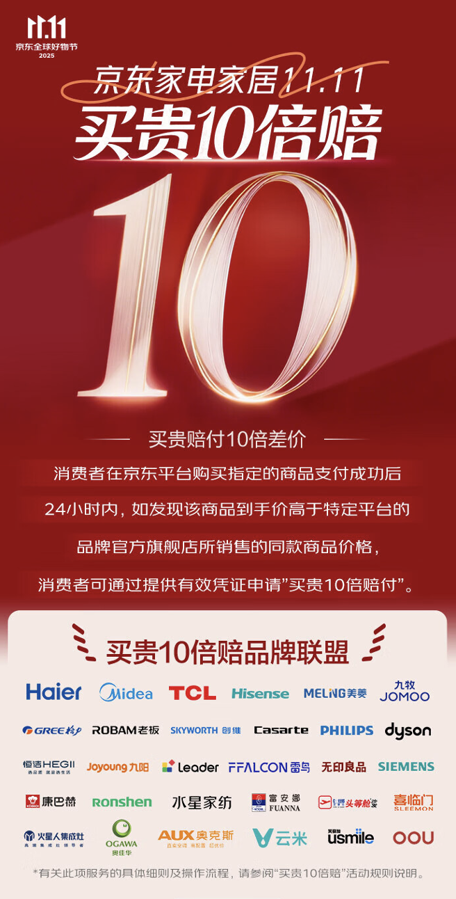 京东“买贵10倍赔”以最直接的方式,为消费者构筑了坚实的价格信任防线,让用户无需比价,即可轻松选购品质过硬、价格优惠的商品。这不仅是对购物体验的升级,更是推动11.11大促回归“让利用户、服务用户”初心的关键一步。