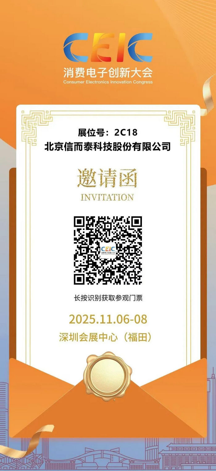 北京信而泰科技股份有限公司诚挚邀请您莅临 2025消费电子创新大会(CEIC 2025) ,与我们共同探索消费电子领域的前沿技术与创新应用。本次大会将于 2025年11月6日至8日 在 深圳会展中心(福田)2号馆 隆重举行,我司展位号为 2C18,期待与您相见!
