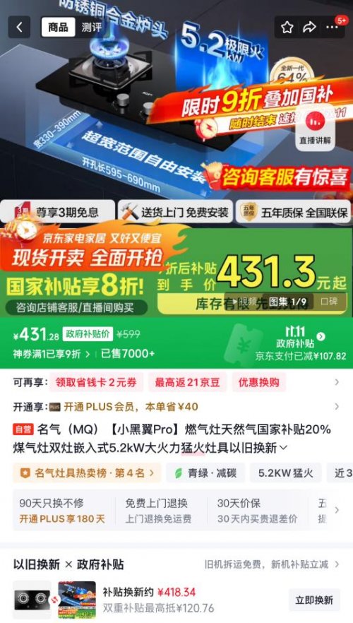 京东11.11厨卫焕新 名气小黑翼Pro燃气灶431元起