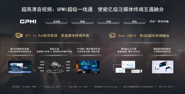视听效果升级了,但设备之间的孤岛仍然存在。针对家庭媒体设备多线杂乱、跨终端互通壁垒、体验割裂等痛点,GPMI超级一线通(General Purpose Media Interface),以音视频、数据、控制、供电四合一双向传输的极简联接能力,基于USB-C接口实现移动与娱乐终端深度融合,更以插卡式微型机顶盒、智家云盒、GPMI TV 等创新形态,带动移动App投屏办公、游戏机超分大屏畅玩、多设备无缝切换观影等需求高效落地。