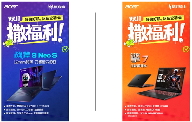 对于追求极致性能的玩家与创作者,宏碁在双十一同样给出了“性能满格”的答案。掠夺者·战斧9 Neo S以至薄处12mm的姿态搭载酷睿Ultra 9 275HX处理器与RTX 5070显卡,在第五代3D刀锋速冷系统的支持下实现冷静而强劲的性能释放;暗影骑士·擎7搭载酷睿i7 HX处理器与RTX 5060显卡,并配备16英寸2.5K 240Hz高刷屏,为主流玩家与创作用户带来兼顾速度与沉浸的游戏体验。宏碁用不同性能档位回应不同热爱——从竞技玩家到视觉创作者,都能在其中找到理想的平衡点。