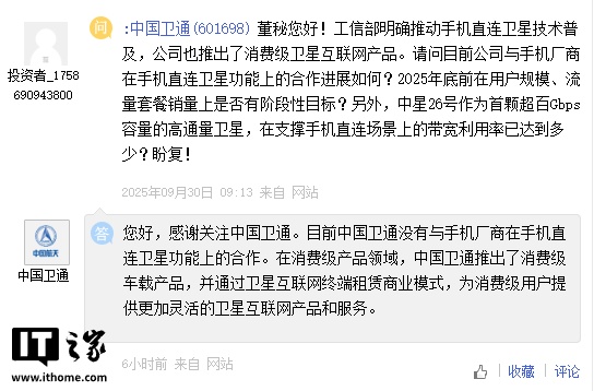 中国卫通:目前没有与手机厂商在手机直连卫星功能上的合作