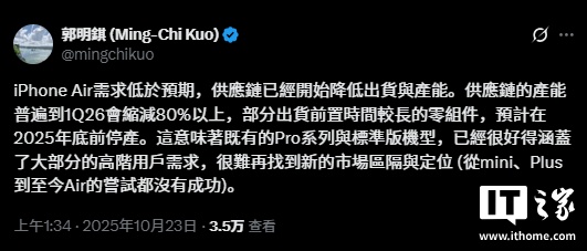 郭明錤:苹果 iPhone Air 需求不及预期,供应链产能将缩减超 80%