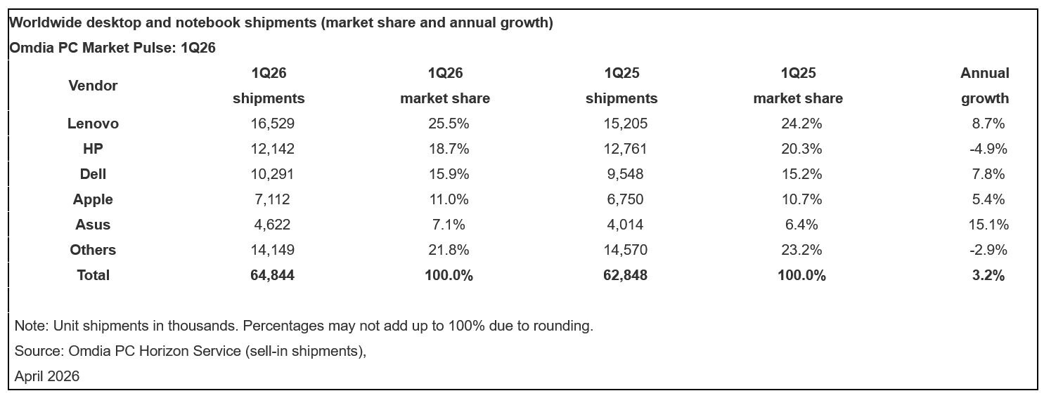 Omdia:Q1 全球 PC 出货量同比增长 3.2%,内存 SSD 涨价挤压全年利润