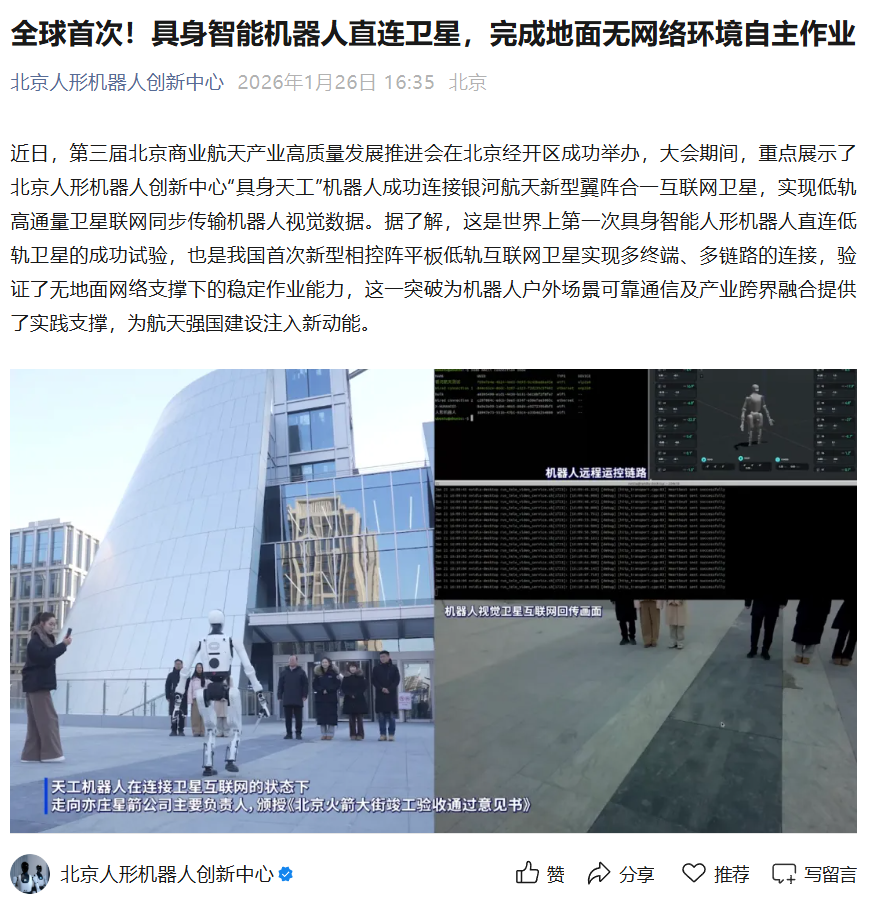 全球首次:北京“具身天工”人形机器人直连卫星,完成地面无网络环境自主作业
