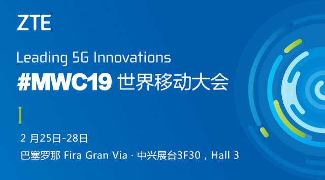 2019年世界移动大会将于2019年2月25日-28日在西班牙巴塞罗那FIRA GRAN VIA 会展中心举行,中兴通讯展台位于Hall 3, 3F30。